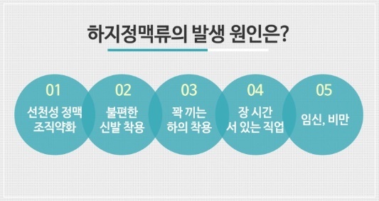 하지정맥류 원인은 심장으로 혈액이 원활히 순환하지 못하고 역류해 혈관에 압력을 가하게 되고 압력을 이기지 못한 혈관이 팽창되어 다리에 노폐물을 함유한 혈액이 고이기 때문입니다. 또 노화, 임신, 호르몬제, 운동부족, 비만, 꽉 끼는 옷, 직업, 외상 등 여러가지 원인에 의해서 나타나는 만큼 어떤 원인으로 인해 하지정맥류가 나타나는 것인지 확인하도록 해야 합니다. 또 하이힐 등의 신발로 다리에 부담을 줘 하지정맥류가 생기기도 합니다.