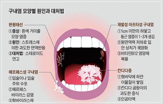 혀와 입 안의 점막은 신체의 외부와 내부를 연결하는 위치에 있어 내부적 변화와 외부적 자극으로부터 모두 영향을 받아 전반적인 건강상태를 반영합니다. 원인을 정확하게 알 수는 없지만 스트레스, 피로, 호르몬 변화, 생리주기, 갑작스러운 체중 변화, 비타민 B12의 결핍, 철분과 엽산의 결핍, 면역력 저하 등에 의해 발병하는 것으로 알려져 있습니다. 또 실수로 볼을 씹거나 자극적인 음식, 알레르기, 치약 성분 등으로 인해 점막에 염증이 생길 수도 있습니다.