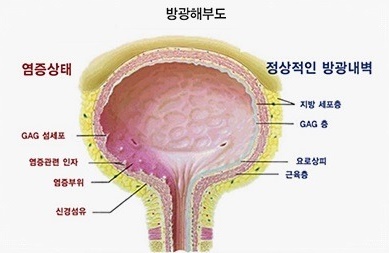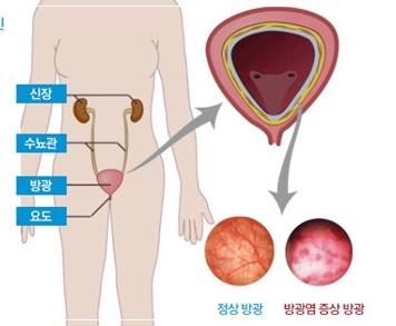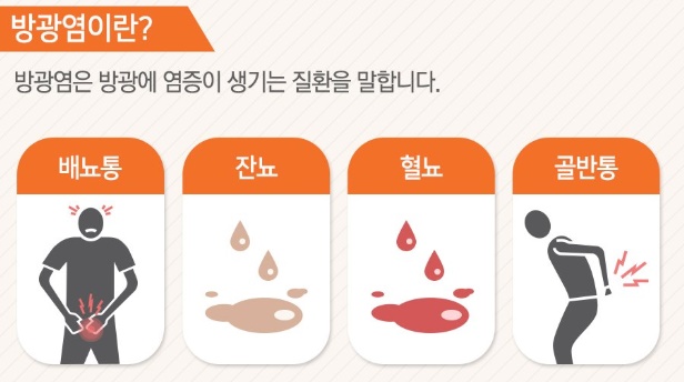 방광염은 급성 방광염, 만성 방광염, 간질성방광염으로 분류됩니다. 급성 방광염은 세균이 침입해 발생하는데 원인균의 80%이상은 대장균이고, 그 외에 포도상구균, 장구균, 협막간균, 변형균 등이 있습니다. 방광염의 증상은 잦은 소변감이 있고 소변 시 통증을 동반하며, 심해지면 허리나 하복부에 통증이 발생하거나 혈뇨, 농뇨가 보이기도 합니다. 만성방광염은 이런 증상들이 만성화됐을 때 발생하게 되고 간질성방광염은 아직까지 원인이 명확하게 밝혀진 것은 없습니다.