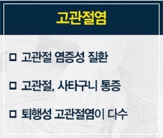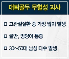 고관절 통증은 통증 자체로 보면 자칫 허리 디스크 질환과 혼동될 수도 있는데 그 이유는 고관절 자체가 다른 부위와는 달리 신체의 깊숙한곳에 있는데다 통증 부위 또한 정확하지 않기 때문입니다. 갑작스럽게 통증이 찾아오기 때문에 대수롭지 않게 여기고 넘겨서 병을 키우는 경우가 많습니다. 특히 이미 퇴행성 진행이 되고 있는 환자의 경우 방치하면 퇴행성 고관절염으로 악화될 수 있습니다.