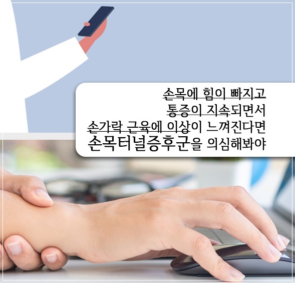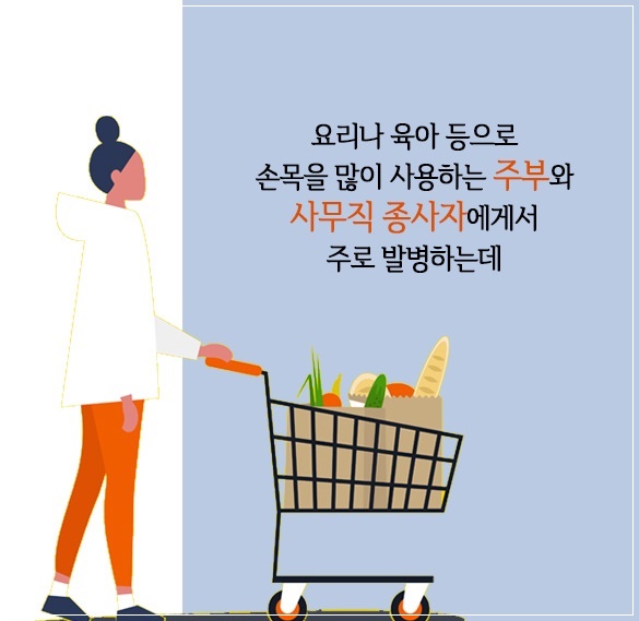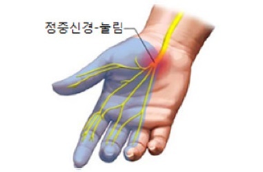 손이 저리면 '손목터널증후군‘을 의심해봐야 합니다. 손목터널증후군은 손목뼈와 인대 사이 신경이 지나가는 좁은 통로가 눌리면서 신경을 압박해 생기는 신경계 질환으로 손목과 손바닥뿐 아니라 손가락까지 저리고, 손을 털면 눌린 통로가 일시적으로 넓어져 증상이 잠시 사라집니다. 심한 경우 손이 타는 듯한 통증에 밤잠을 설치거나, 저리고 쑤시는 통증이 팔꿈치·어깨·팔 전체로 확대되기도 합니다. 집안일을 하며 손목을 많이 쓰는 주부나 당뇨병 등으로 인해 인대가 두꺼워진 사람에게 잘 발병합니다.