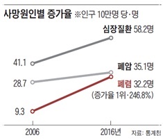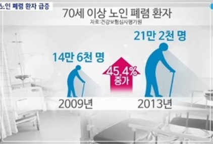 사망률도 70배 이상 급격하게 증가한다. 건강보험심사평가원에 따르면, 65세 미만 성인의 폐렴 사망률은 10만 명당 3명이었으나 노인의 경우 10만 명당 209.1명으로 높아집니다. 폐렴에 걸리면 보통 기침·가래·발열·오한 등의 증상이 나타납니다. 그러나 노인의 경우 무증상도 많은데 노인 폐렴 환자 10명 중 2~3명은 아무런 증상도 겪지 못한다고 알려졌습니다. 대부분 폐렴을 앓은 지 2주가 지나서야 병원에 내원합니다.