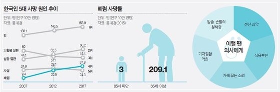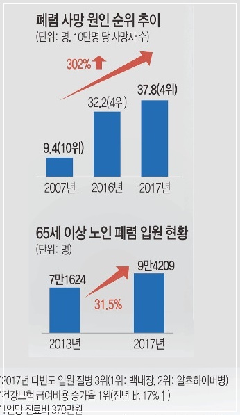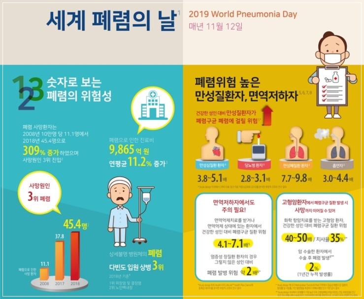남보원이 앓았던 폐렴은 폐에 바이러스나 세균 등의 미생물이 감염되는 질환으로 2018년 국내 주요 사망 원인별 사망률 추이 분석에 따르면 폐렴에 의한 사망 비율은 10만명당 45.4명으로 암, 심장질환에 이어 세 번째였습니다. 모든 나이에서 발생하지만, 노인은 면역력이 약해 폐렴 발병 위험도 크고, 발병 시 더 치명적입니다. 실제로 지역 내 폐렴 환자가 발생했을 때, 65세 이상 노인이 폐렴에 걸릴 확률은 일반 성인 발병률에 비해 3.4배 높았습니다.