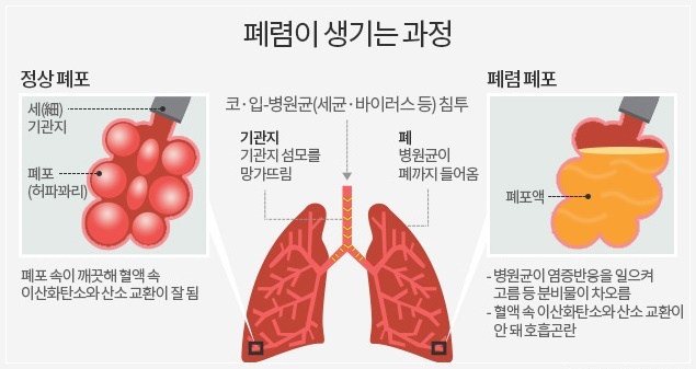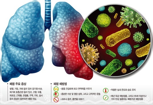 증상이 나타나더라도 일반 감기와 비슷해 알아차리기 어려워 쉽게 방치됩니다. 제때 치료하지 않으면 패혈증·폐농양으로 이어지고 결국 사망에 이를 수 있습니다. 폐렴을 예방하려면 평소 세균에 감염되지 않도록 개인위생을 철저히 해야 하는데 외출 후에는 반드시 손을 씻고 흡연·음주를 피해야 합니다. 꾸준한 운동과 충분한 휴식을 통해 면역력을 기르는 것도 도움이 됩니다. 65세 이상 노인이나 만성질환을 앓고 있는 사람은 폐렴구균 백신을 접종하는 게 안전합니다.