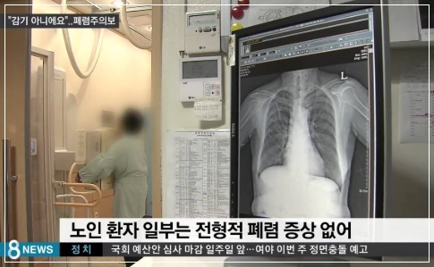 X-ray 검사에서도 병변이 보이지 않는 경우가 많습니다. 오히려 폐렴 증상과 상관없는 무기력, 의식 저하, 식욕 부진, 근육통 등이 나타납니다. 대부분 컨디션이 좋지 않을 때 흔하게 나타나는 증상이라 폐렴을 의심하기가 쉽지 않습니다. 원래는 세균 등 이물질이 폐에 들어오면 이를 내보내기 위한 반사작용으로 기침을 하고 가래를 만들어낸다. 그러나 노인은 노화로 인해 폐 기능이 저하되 이 기능이 떨어진 상태라 세균이 들어와도 몸이 반응하지 않습니다.