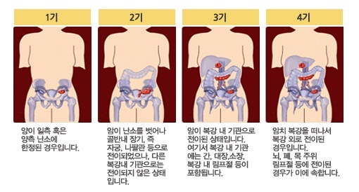 난소암은 1~4기로 나뉘며 1기는 난소에 국한된 경우, 2기는 골반 내까지 파급된 경우, 3기는 복강 내 파급되었거나 림프절 전이가 있는 경우, 4기는 복강 내를 벗어나 간이나 뇌, 폐 등에 전이된 경우를 말합니다. 치료는 암을 절제하는 수술이 기본으로 병기에 따라 다르지만 최대한 많은 암을 제거하는 것이 예후에 도움이 됩니다.