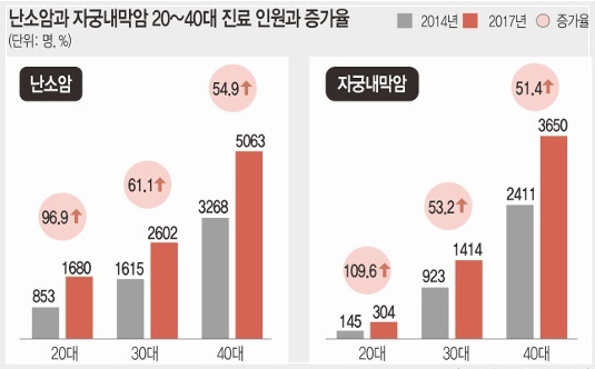 환자 70%가 3기 이상에서 발견되는 '난소암'의 경우 95%가 가족력이 없는 상태에서 발생하는데 조기 증상도 복부 통증, 팽만감, 질출혈 등 생리 전후로 겪는 일반적인 증상으로 나타납니다. 난소암은 대부분 40~70세에서 발생하는데 난소암의 발생 원인은 명확히 밝혀지지 않았지만 초경이 빠르거나 폐경이 늦은 경우, 불임이거나 출산 경험이 없는 경우 발생 가능성이 증가합니다. 유방암, 자궁 내막암, 직장암 환자의 경우에도 난소암 발생 위험이 비교적 높고 어머니나 자매가 난소암으로 사망한 여성은 난소암 발생 위험이 그렇지 않은 사람의 18배로 높습니다.