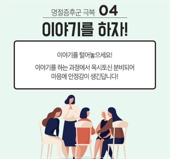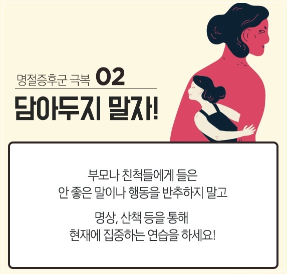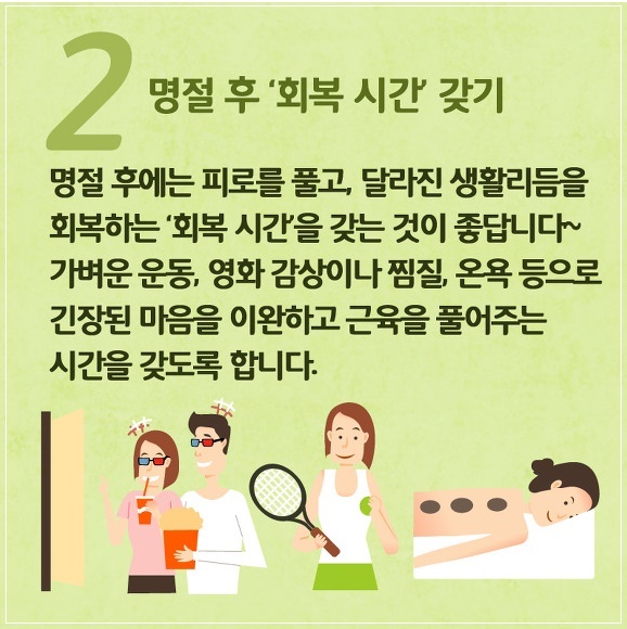명절증후군은 신체적 피로뿐 아니라 정신적 피로를 동반하는 경우가 많습니다. 기분이 우울하고 무기력해지며, 짜증이 쉽게 나는 등 정신적 스트레스가 발생할 수 있으며 오랜만에 만난 가족, 친척들로부터 받는 지나친 관심과 간섭이 오히려 스트레스가 되는 경우가 있습니다. 정신적 피로가 심하면 불면증과 같은 현상이 발생할 수 있는데 사전에 규칙적인 생활을 유지해 생체리듬을 미리 회복해주는 것이 중요합니다.