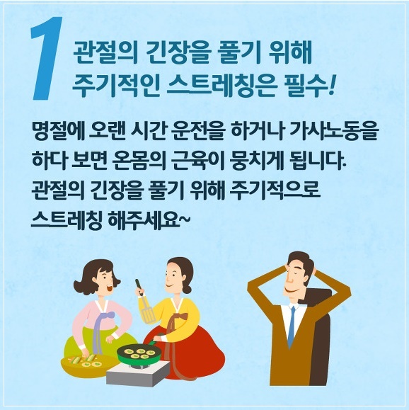 명절 기간 강도 높은 가사노동과 장시간 운전으로 근육통이 생겼다면 스트레칭을 통해 근육을 풀어주는 것이 중요합니다. 힘들고 피곤하다는 이유로 누워있거나 잠을 자는 것보다는 통증 부위를 안마해주고, 스트레칭으로 뭉친 근육들을 풀어주는 것이 좋다. 통증이 심한 부위에는 냉‧온찜질을 해주는 것도 좋은 방법입니다.