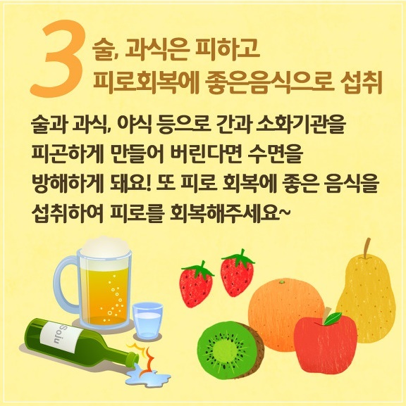 운전자는 출발 전 과음과 과식을 피해야 한다. 피로를 덜기 위해선 올바른 자세를 유지하는 것이 중요합니다. 장시간 좁은 공간에서의 같은 자세로 있다 보면 근육의 긴장상태가 오래 지속돼 전신 근육통이나 관절통을 유발할 수 있습니다. 운전석의 위치는 페달을 밟을 때 무릎이 적당히 구부러지게 하고, 등은 등받이에 기대어 10~15도 정도로 유지하는 것이 좋습니다. 평소 허리가 좋지 않다면 타월을 둥글게 말아 허리 뒤에 받쳐주는 것도 효과적입니다.