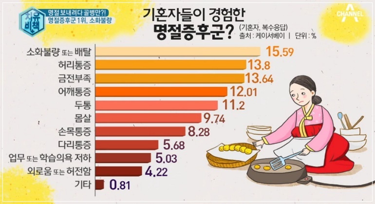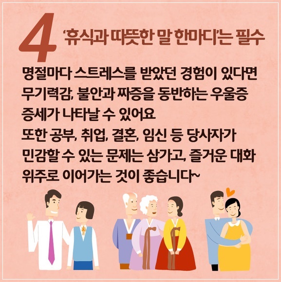 명절은 평소 자주 보기 힘들었던 가족을 만나고 연휴 동안 피로를 풀 수 있는 기회입니다. 하지만 장시간 운전과 제사‧차례 상차림 준비 등 강도 높은 가사노동으로 인한 육체적‧심적 부담도 만만치 않습니다. 이렇다 보니 명절 때 받은 스트레스로 명절증후군이란 용어가 흔히 쓰일 정도입니다. 오늘은 명절 전후로 나타나는 명절증후군에 대해 알아보겠습니다.