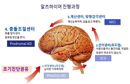 알츠하이머 병은 여러가지 증상을 유발하는데 기억장애는 알츠하이머병 환자가 처음에 호소하는 증상이자, 가장 흔하게 나타나는 증상입니다. 병의 초기에는 새로운 정보의 등록, 저장, 재생(단기기억)이 어려워집니다. 또한 언어장애(실어증)도 동반하는데 물건의 이름이 금방 떠오르지 않습니다. 환자들은 모호하게 돌려 말하며 ‘그런 것’ 같은 표현을 자주 사용합니다. 근력(힘)이나 명령을 이해하는 데는 이상이 없어도 일상적인 생활 동작, 요리하기, 세수하기, 옷 갈아입기 등에서 장애를 보입니다.