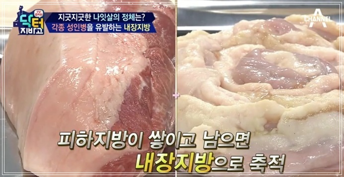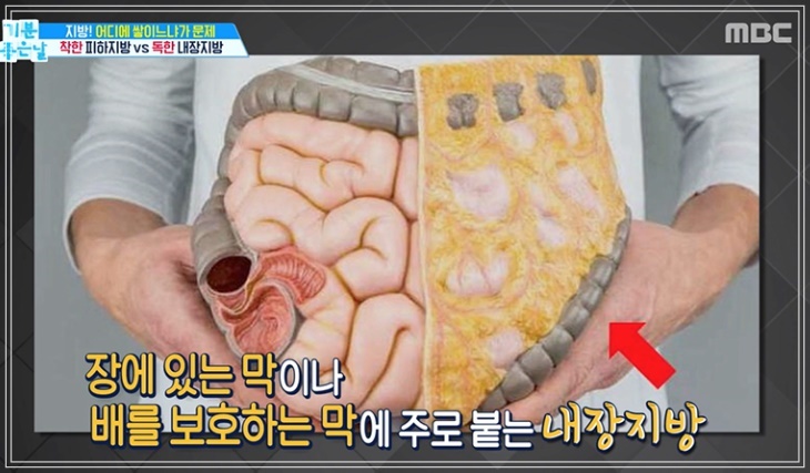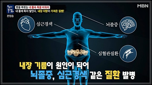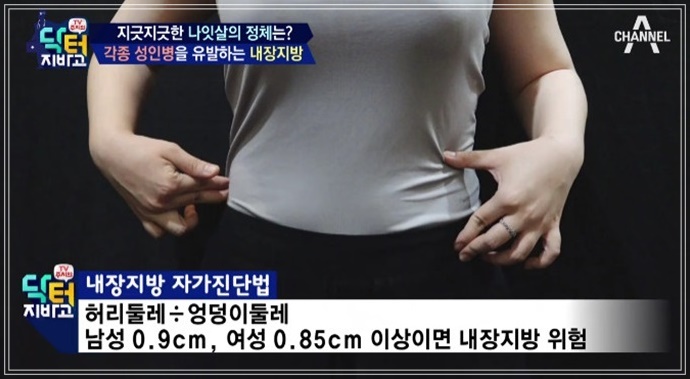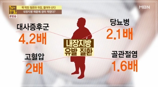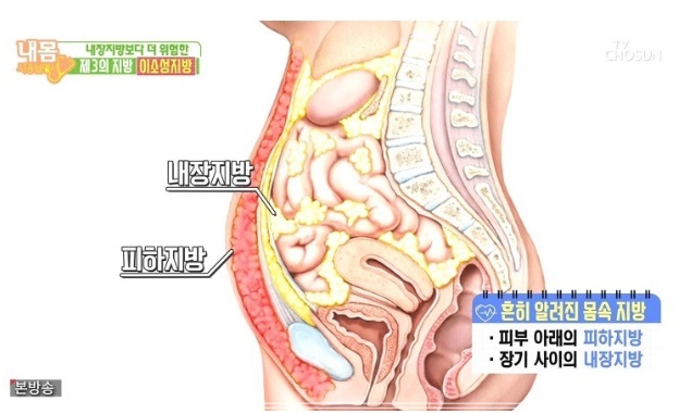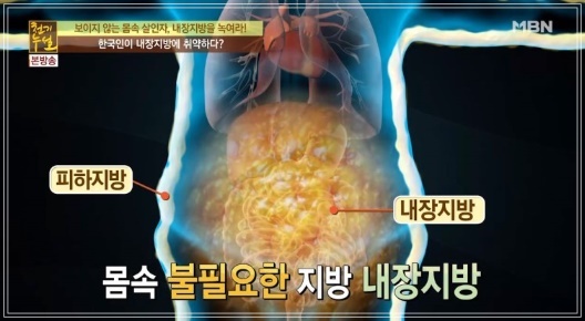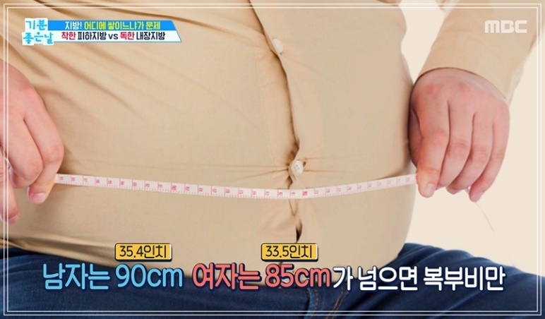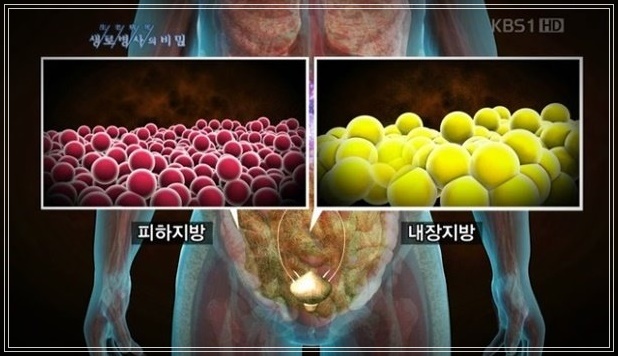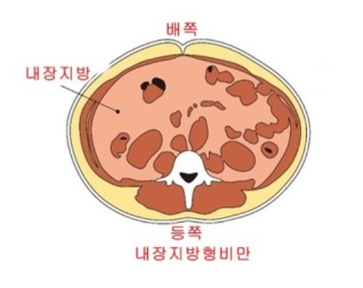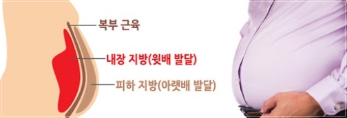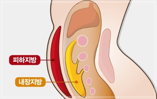 내장지방은 내장기관 주변을 둘러싸고 있어 육안으로 확인할 수 없습니다. 내장지방은 허리둘레로 측정하는데 남자는 90cm(35인치), 여자는 85cm(33.5인치)이상일때 내장지방이 많은 것을 의미합니다. 내장지방은 사이토카인(cytokine)이라고 불리는 염증성 단백질을 분비하여, 염증을 유발하고 인슐린의 효율을 떨어뜨립니다. 따라서 좋은 콜레스테롤인 HDL 콜레스테롤은 줄어들고 혈당과 중성지방은 증가하게 되어 당뇨병과 심장질환의 위험성이 증가합니다. 한 연구에 따르면 허리둘레 37인치 이상인 백인 여성의 경우 심장 또는 호흡기 질환으로 사망할 가능성이 더 높은 것으로 나타났습니다.