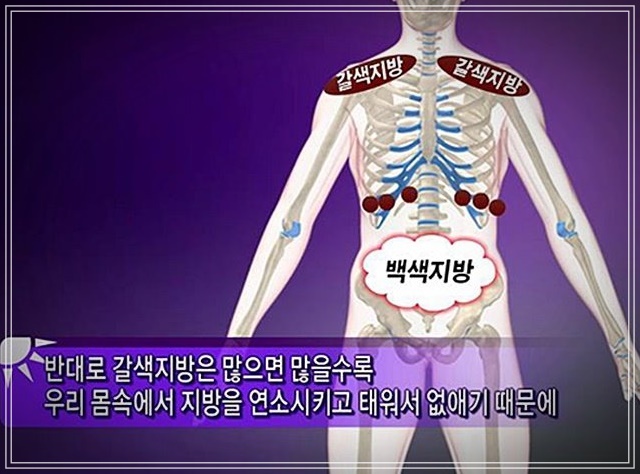 갈색지방은 수많은 미토콘드리아로 채워져 있어 갈색을 띄는 지방으로 주로 목, 쇄골, 가슴 주위에 적은 양 존재합니다. 우리가 태어날 때는 많은 양의 갈색지방을 갖지만 나이가 들어가며 감소하게 됩니다. 이는 신생아의 경우 스스로 체온을 조절할 수 없기 때문에 갈색지방이 영양분을 소모하여 열을 발생함으로써 체온을 유지하는데 필요하지만 성인의 경우 스스로 체온을 조절할 수 있기 때문에 갈색지방의 필요성이 줄어들기 때문입니다.갈색지방의 주요 목적은 체온을 조절하는데 있습니다. 우리가 추운 환경에 노출되었을 때 대사적으로 활성화되며 에너지를 소모하여 열을 발생시킵니다.