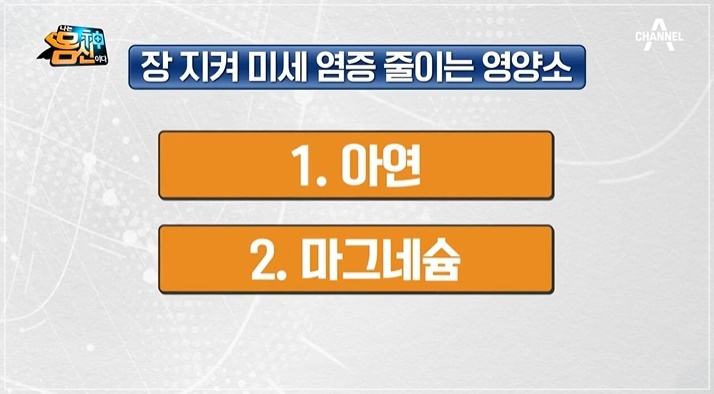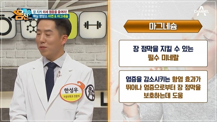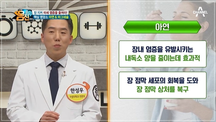 반면, 염증을 없애고 장 건강을 지키는 영양소 아연과 마그네슘, 오메가-3를 추천합니다. 아연은 장내 염증을 유발하는 내독소양을 줄이고 장 점막 상처를 복구하는 효과가 있습니다. 마그네슘은 장 점막 염증을 감소하고 항염효과가 뛰어난 성분으로 알려졌습니다.