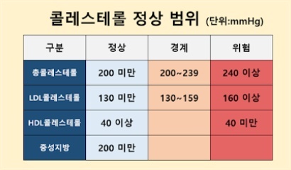 콜레스테롤은 우리 몸에 꼭 필요한 지방성분입니다. 하지만 이 지방성분이 필요 이상으로 많아져 혈관 벽에 쌓이면 동맥 내부에 죽처럼 끈적끈적하게 붙어있는 고지혈증으로 연결됩니다. 이 상태가 지속되면 혈관이 점점 좁아져 심장과 뇌에 적절한 혈액을 공급하지 못해 심근경색, 협심증 등이 발생합니다.