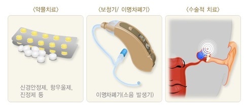 아직 이명에 대한 완전한 치료법은 없으나 현재 여러 치료법이 함께 사용되는데 먼저, 약물요법이 시행될 수 있습니다.이명을 유발하는 질병을 치료함으로써 이명 증상을 경감시킬 수 있는데 특정 질환이 있는 경우, 해당 질환을 치료하는 것이 우선이며 그 외에는 신경안정제, 항우울제, 진정제 등이 이명의 악순환을 억제하는 데 쓰입니다. 또한 보청기 착용이 도움이 되기도 하는데 주변 소음의 증가로 이명을 느끼지 않게 하는 효과가 있습니다.
