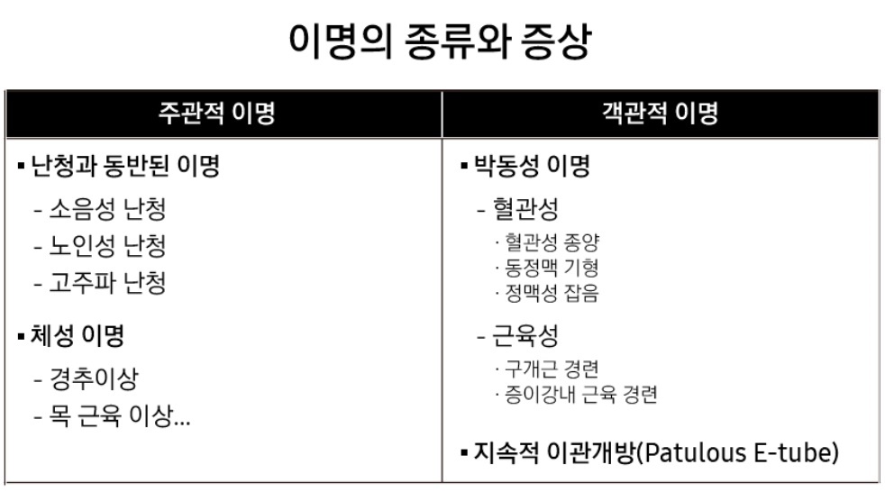 이명이 있는 사람뿐 아니라 다른 사람에게도 소리가 들립니다. 귀 주변을 지나는 혈관에서 나는 소리, 귀와 목 주변 근육의 수축 또는 경련에 의한 소리, 턱 관절 기능 장애, 이관기능 장애 등 몸 속 소리가 몸을 통해 귀에 전달돼 들립니다.