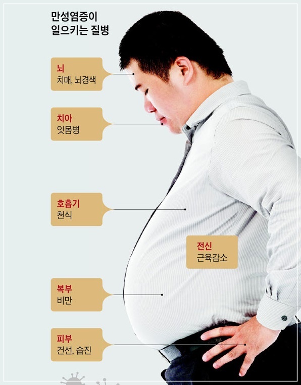 만성염증은 혈관을 타고 곳곳을 돌아다니며 신체를 손상시킵니다. 세포 노화와 변형을 일으키고 면역 반응을 지나치게 활성화해 면역계를 교란하며 근육감소증도 유발합니다. 이외에 잇몸병, 대장염, 지루성 피부염 등 각종 염증질환을 유발합니다.