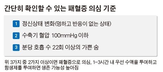 패혈증 초기 증상 다음 중 두 가지 이상의 증상이 나타나면 바로 병원에 가야 합니다.