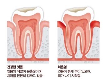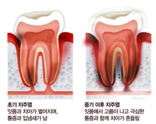 치주질환은 크게 치은염과 치주염 두 종류로 나뉩니다. 치은염은 질환이 잇몸에만 있을 경우이고, 치주염은 치은염이 악화돼 염증이 치조골(치아를 받쳐주는 뼈)에까지 확산된 것입니다.