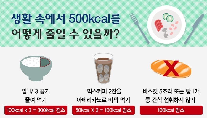 갑자기 체중을 감소하거나 섭취량을 줄이면 오히려 몸에 무리가 갈 수 있는데 하루에 500~1,000 kcal 정도의 열량섭취를 줄여 체중을 줄여 나가는 것이 좋습니다.