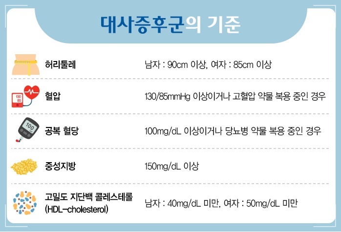 - 복부 비만: 남성의 경우 허리둘레가 90cm 초과, 여성의 경우에는 80cm 초과되었을 때