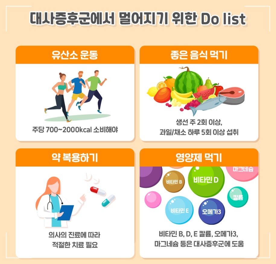 위 사항 중 3개 이상 해당되면 대사증후군을 의심하고 건강과 식단 관리에 유의해야 합니다. 대사증후군을 방치할 경우 심근경색, 뇌졸중과 같은 심뇌혈관 질환으로 이어질 위험이 높습니다.