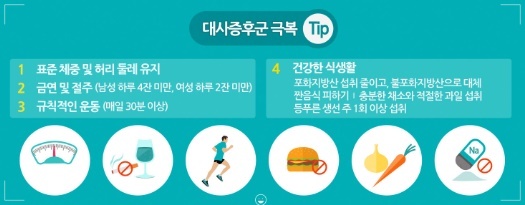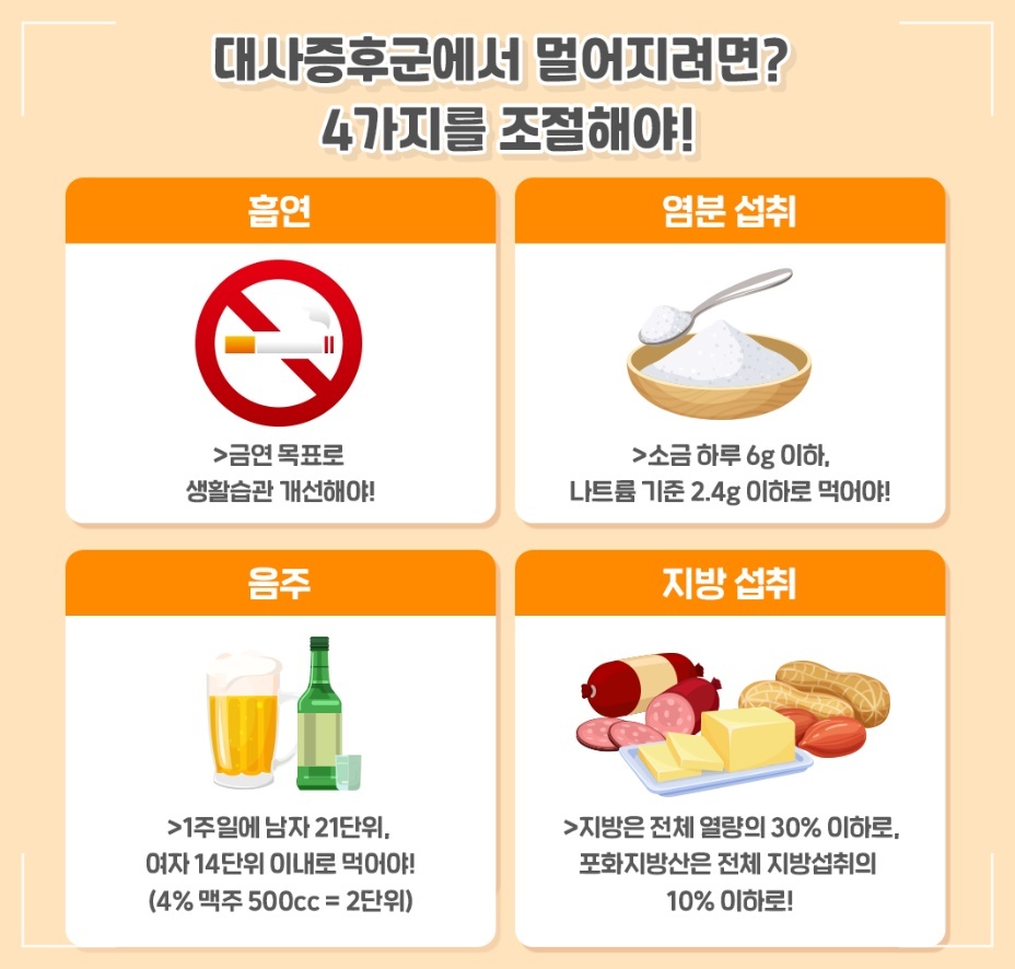 한국인의 주식은 쌀로 그외 주전부리는 떡이나 떡볶이와 같은 주성분이 탄수화물로 이뤄진 음식이 많습니다. 그렇기 때문에 탄수화물을 줄이는 식습관에 신경을 쓰며 대사증후군을 예방해야 합니다.