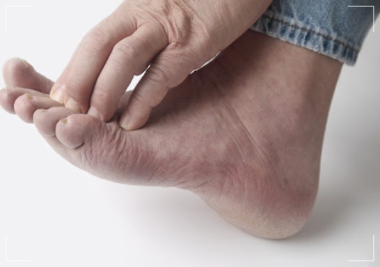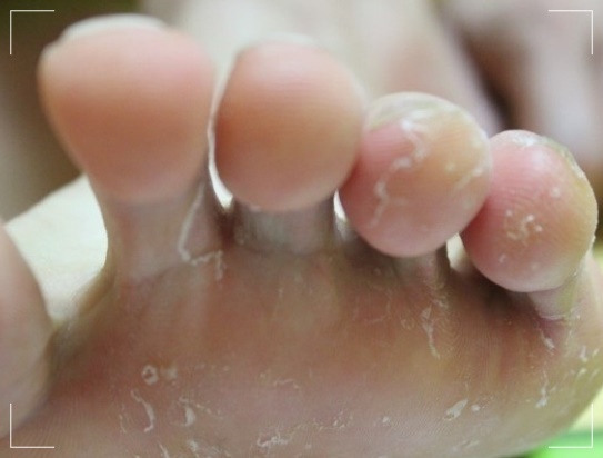 발가락 사이 각질이 벗겨지고, 하얗게 짓무르면서 꼬릿한 냄새가 나면 지간형 무좀입니다. 세 번째와 네 번째 발가락 사이나, 네 번째와 다섯 번째 발가락 사이는 발가락끼리 맞닿아 있고, 습해서 피부사상균이 자라기 가장 좋은 부위입니다.