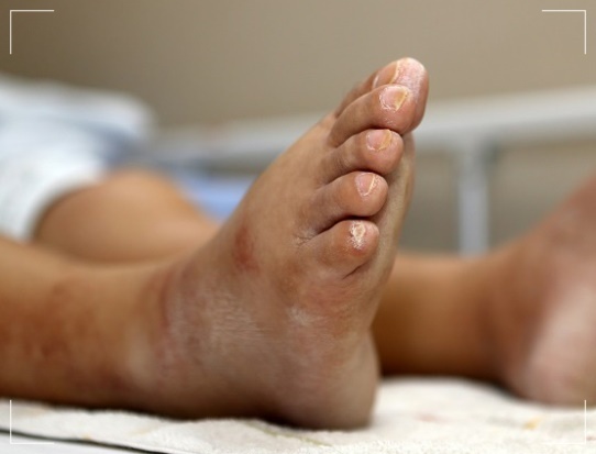 수포형은 발바닥과 발가락에 크고 작은 물집(수포)이 생기는 것이 특징으로 땀이 많아지는 여름철에 급증합니다. 땀이 나면 피부가 습해지고, 불어서 피부사상균이 각질층과 표피층 사이로 쉽게 들어가 물집이 생기고 심한 가려움증이 나타납니다. 가렵다고 긁으면 물집이 터지고 세균에 감염되기 쉽습니다.