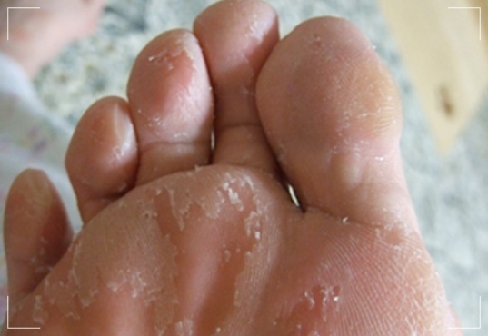 발바닥의 각질이 전반적으로 두터워지고 긁으면 고운 가루처럼 떨어지는 각화형 무좀은 가렵지도 않고 냄새도 없어서 무좀인지 모르는 경우가 많습니다. 하지만 방치하면 두꺼워진 각질이 갈라지고 피가 납니다. 각화형은 항진균 치료에 앞서 피부연화제(피부 결을 부드럽게 해주는 약물)를 사용해서 두꺼워진 피부와 각질층을 얇게 만드는 것이 중요합니다.