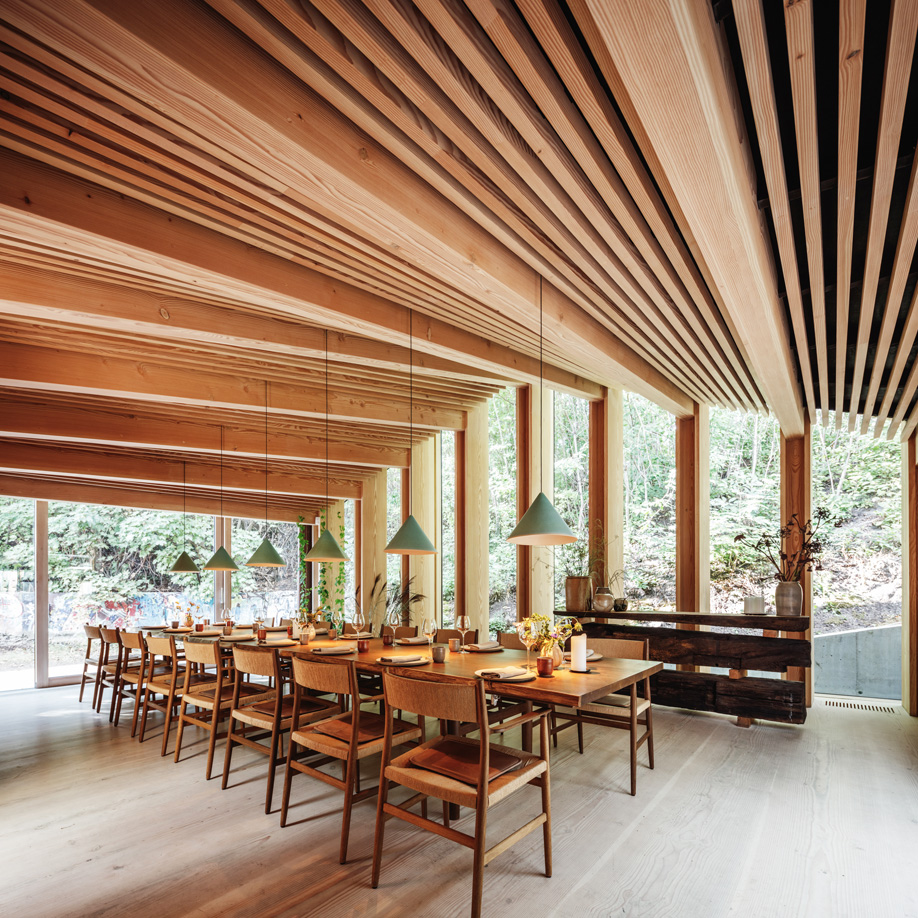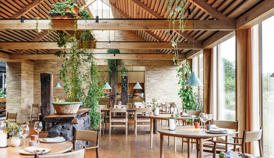 내부를 살펴보자면 20세기 중반 황금시대의 덴마크 건축가들이 직접 설계한 개인 주택을 떠오릅니다. 아늑하고 가정적인 느낌이 전체 식당으로 느낄 수 있으며, 또한 특별히 디자인한 6미터 길이의 훈제처리한 오크 테이블과 아르브 의자가 더글라스 소나무 판자로 만든 관절 천장과 함께 조화를 이룹니다. '유산(heritage)'으로 번역할 수 있는 단어인 'Arv'는 친숙한 덴마크의 대사들을 특징으로 하지만 상당히 현대적인 외관을 가지고 있습니다. 자연주의와 북유럽 인테리어의 단면을 볼 수 있는 훌륭한 예라고 생각됩니다.