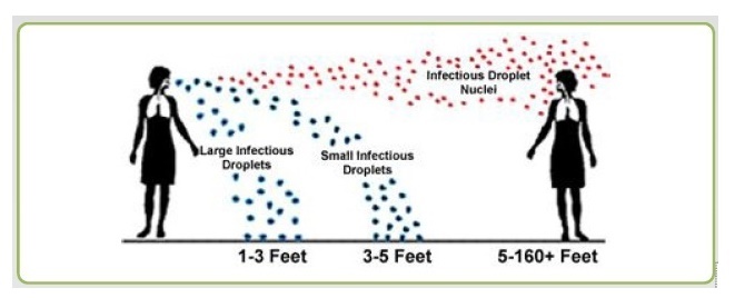 에어로졸 전파는 침방울 등 비말에 혼합됐던 바이러스가 오랫동안 공기 중에 혼입돼 수십 피트를 떠다니며 통풍이 잘되지 않는 방에서 감염을 일으키는 방식을 말합니다. 버스 및 기타 밀폐 공간에서는 서로 6피트(1.8m) 떨어져 있더라도 감염 위험이 있다는 것입니다.