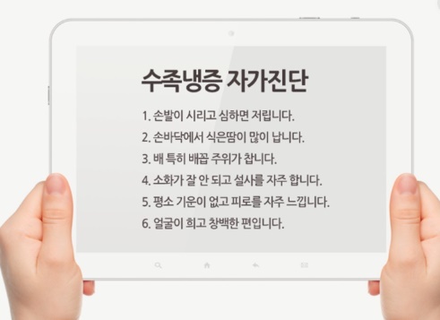 대부분 사람들이 손발이 찬 것을 체질 혹은 나이가 들어서라고 오해하는 경우가 많지만 수족냉증은 만성동맥경화의 하나인 말초동맥질환의 원인이 되는 경우도 있습니다. 수족냉증은 손과 발이 찬 것을 넘어 감각저하, 통증, 가려움증 등이 동반됩니다. 손이 자주 저리면서 체온과 손발의 온도차가 2도 이상인 경우, 피부 색깔이 푸른색으로 변하면서 통증이 동반된다면 레이노 증후군을 의심해 볼 수 있습니다.