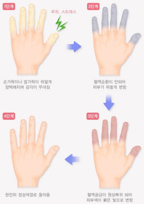 대체로 추위나 외부 온도, 자극들에 몸이 민감하게 반응해 교감신경계에 이상이 있을 때 수족냉증의 증상이 발생할 수 있으며 이외에 출산이나 폐경 등 호르몬 변화 그리고 스트레스, 레이노병, 류마티스성 질환 등 질환에 의해 수족냉증이 나타나기도 합니다.
