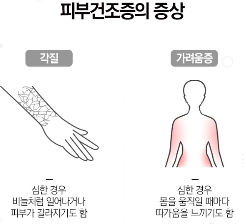 겨울철 피부 가려움증은 다리와 팔 등에서 더 쉽게 나타나고 얼굴 등에도 증상이 나타날 수 있으며 점차 옆구리, 마찰이 심한 골반, 허리주위 등 온몸에서 증상이 나타나게 됩니다. 증세가 심해지면 논바닥이 갈라지는 것과 유사하게 피부 표면이 변하면서 따끔거리고, 더 악화되면 자세를 바꿀 때 피부가 당기고 아프기도 하며 또한, 피부 표면에 미세한 균열이 발생하면서 피가 나거나 진물이 발생하게 됩니다.
