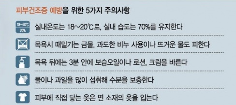 겨울철 피부 가려움증을 예방하기 위해서는 하루 8컵 물을 마시고, 목욕은 15~20분이내로 미지근한 물로 하는 것이 좋습니다. 목욕후에는 보습크림이나 오일을 발라줍니다. 실내온도를 낮추고 습도 40% 이상을 유지해야 하는데 가습기나 화초를 키우고 세탁물을 널기 등의 방법을 이용할 수 있습니다. 가려움증이 증상이 나타난다면 일단 보습제로 가려움증을 가라앉힌 후 병원을 방문해 진료를 받는 것이 가장 좋습니다.