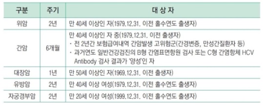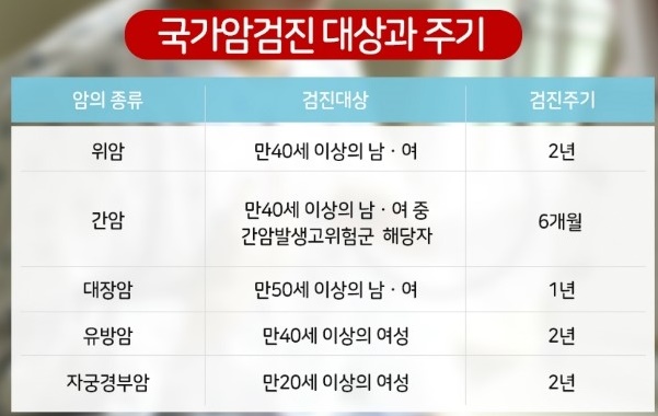 암검진은 위암(만40세 이상, 2년마다), 간암(만40세 이상 간암 고위험군, 6개월마다), 대장암(만50세 이상, 1년마다), 유방암(만40세 이상 여성, 2년마다), 자궁경부암(만20세 이상 여성, 2년마다) 등 5대암이 대상입니다. 검진비는 공단이 90%, 수검자가 10% 부담하며 건강보험료가 일정 기준 이하이면 국가암검진 대상자로 분류되고, 본인부담금 10%를 국가와 지방자치단체가 부담합니다.