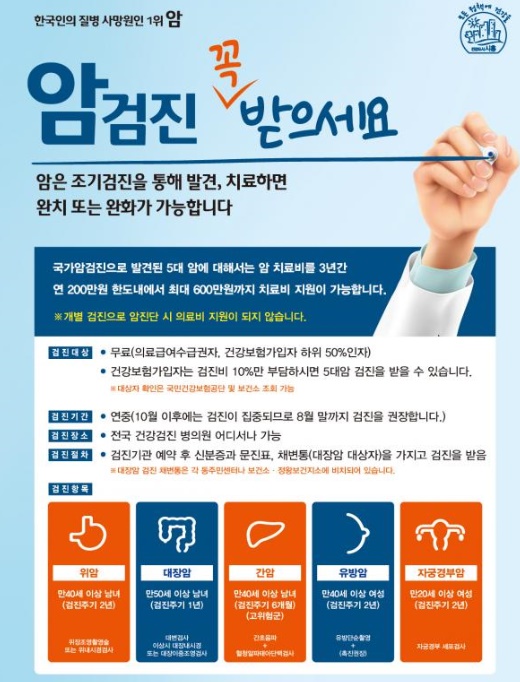 검진대상자 추가신청은 지역가입자와 피부양자는 공단 지사를 방문하거나 고객센터(1577-1000)로 신청하면 되고, 직장가입자는 회사가 '사업장 건강(암)검진대상자 변경(추가)신청서'를 작성해 공단 관할 지사에 제출하면 됩니다. 국가건강검진을 받지 않는다고 해서 불이익은 없지만 암검진을 통해 암이 확진될 경우 건강보험료 하위 50% 이하 가입자와 의료급여수급권자는 의료비 지원을 받을 수 있습니다.