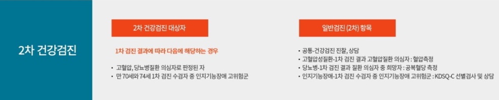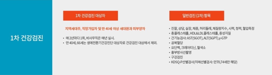 일반검진의 공통검사 항목은 진찰상담·신체계측·시력청력검사·흉부방사선 검사·혈액검사·요검사·구강검진입니다. 성·연령별 항목은 이상지질혈증· B형간염항원·골밀도 검사·인지기능장애·정신건강검사·생활습관평가·노인신체기능검사·치면세균막검사입니다. 일반검진 결과, 고혈압·당뇨병 의심자로 판정되면 가까운 병·의원에서 확진검사를 받을 수 있으며 진료와 검사 1회에 한해 공단이 전액 부담합니다. 확진검사는 다음 해 1월 31일까지 받아야 합니다.