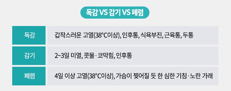 A형과 B형으로 나뉘는데 현재 유행하고 있는 독감은 A형입니다. 38℃ 이상의 갑작스러운 발열, 기침, 인후통 등의 호흡기 증상과 근육통, 피로감 등 전신 증상을 동반합니다.