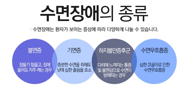 수면장애의 종류로는 불면증, 기면증, 수면무호흡증, 하지불안증후군 등이 있습니다. 수면장애 증상은 자신이 알 수 있는 불면증 같은 경우도 있지만, 기면증이나 수면무호흡증 같은 경우에는 본인이 인지를 하지 못하는 경우가 많기 때문에, 지인의 도움이 없이는 증상조차 알 수 없습니다. 수면장애 진단을 위해서는 입원을 하여 하루 동안 검사를 받는 수면 다윈검사를 받아야지만 해당 장애 진단이 가능합니다. 방법은간단하며, 일상생활처럼 행동한 후에 잠에 들기만 하면 됩니다.