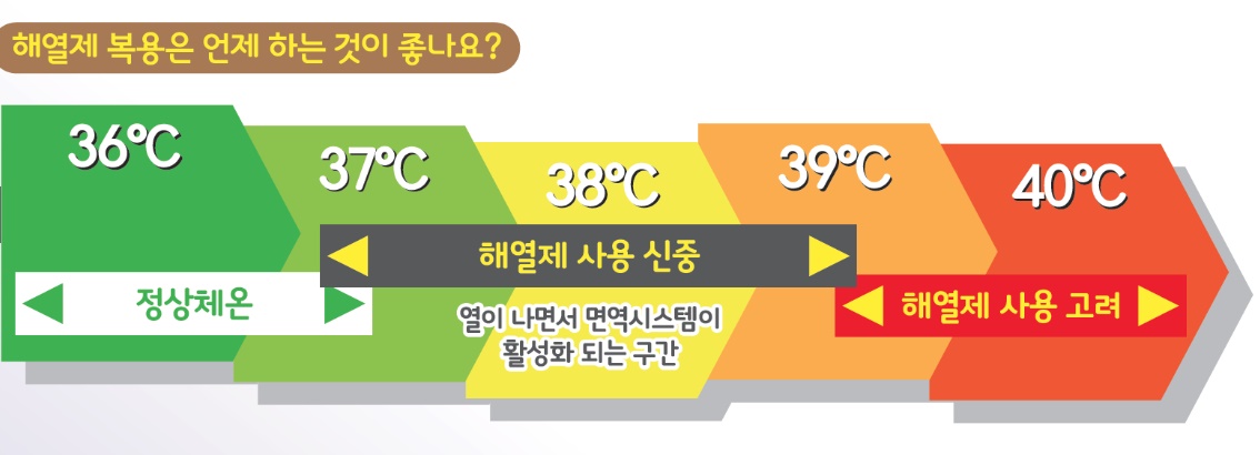 먼저 아이가 열이 나면 침착하게 아이의 전반적인 상태를 살피도록 합니다. 열은 나지만 아이가 평상시처럼 놀며 잘 먹고 잠도 잘 잘 경우에는 아기의 열을 꼭 ‘치료’하지 않아도 됩니다. 보통 39℃ 이상이거나 아이가 열로 힘들어할 때 해열제를 사용할 수 있습니다. 해열제의 용량은 나이 보다 체중으로 계산하는 것이 정확하며, 해열제를 먹일 때에는 정확한 용량을 주는 것이 중요하며 성인용 해열제를 쪼개서 주는 일은 없어야 합니다.