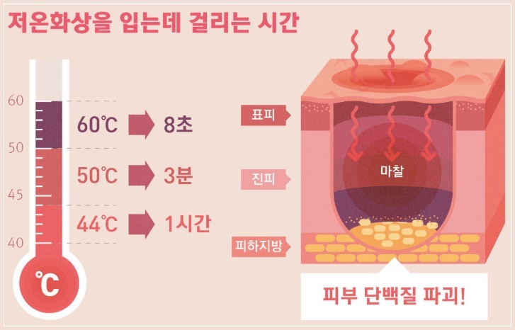 저온화상은 40~45℃ 정도 열에 오랜 시간 노출되어 피부가 손상되는 화상을 의미합니다. 오랫동안 피부가 열에 노출되면 노출 부위 피부로 가는 혈액순환이 느려지게 되며 피부조직에 축적된 열은 다른 부위로 이동하지 못해 노출부위 피부 온도가 상승하여 화상을 입게 되는 것입니다. 핫팩은 발열이 10시간 이상 지속되고 최고 70도까지 올라가므로 방심할 경우 저온화상을 입을 우려가 있습니다.