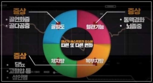 폐경기 전조증상의 세 번째는 골다공증입니다. 에스트로겐은 칼슘흡수촉진하고 유출을 막는 중요한 역할을 하는데 나이가 들면서 에스트로겐의 분비가 감소되면 골손실이 심하게 되어서 골다공증 현상이 나타납니다. 우리나라 폐경기 여성의 약 40%가 골다공증이라는 통계도 나올 정도로 흔하게 볼 수있는 폐경기 전조증상입니다.