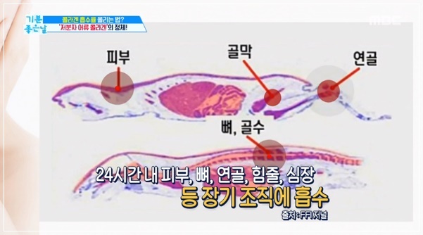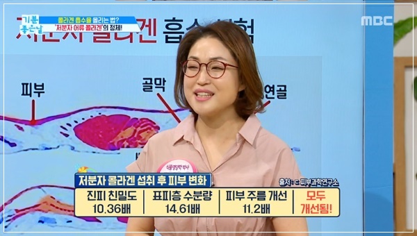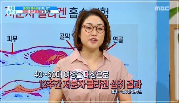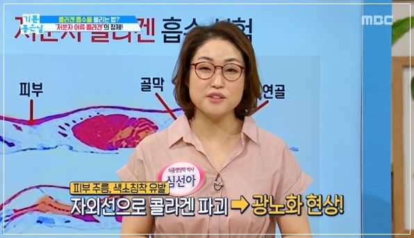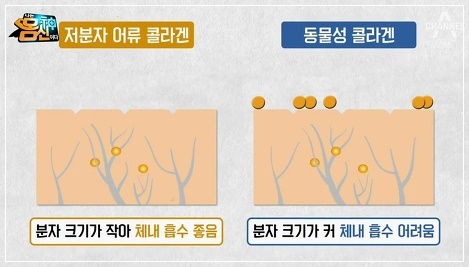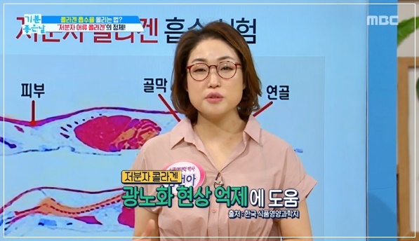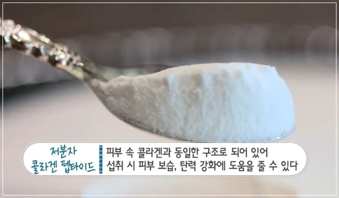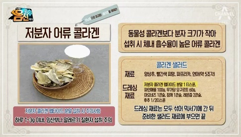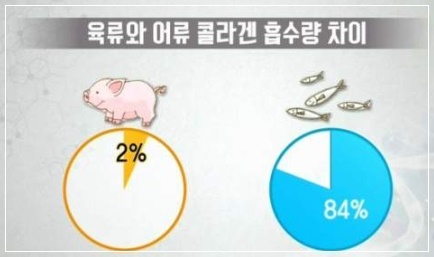 체내 콜라겐의 생성량이 감소되면 피부탄력을 잃고 주름살이 느는 원인이 됩니다. 동물성 콜라겐은 고분자로 몸에 흡수되는 성분이 2%밖에 되지 않지만 명태, 연어 껍질 등에 있는 어류 콜라겐은 우리 몸에 84% 흡수되는 것으로 알려졌습니다. 어류(피쉬) 콜라겐으로도 불리는 이 성분은 동물성 콜라겐 보다 훨씬 높은 흡수량을 가지고 있어 피부 탄력 등에 좋은 음식으로 꼽힙니다.