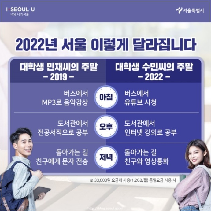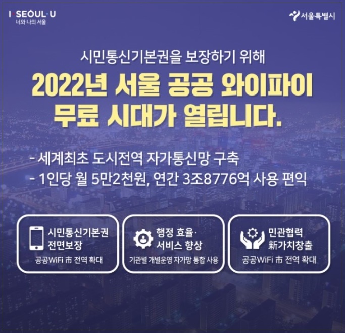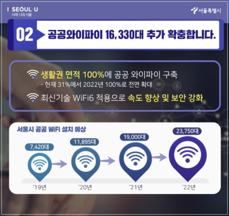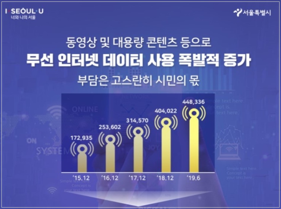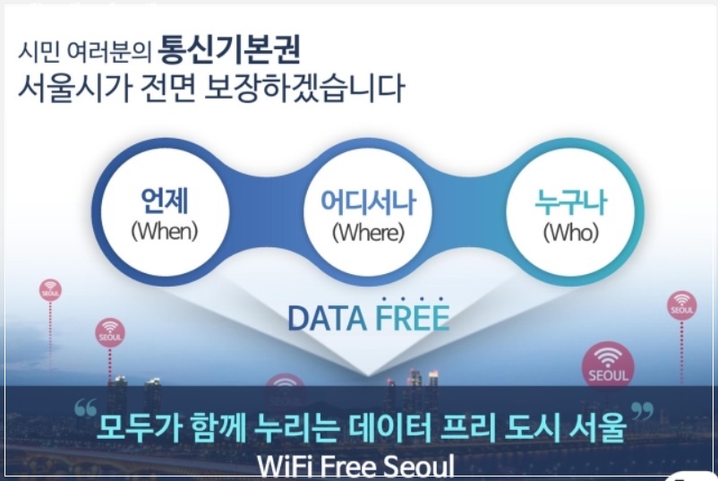 서울시는 2022년까지 서울 전역 공공장소에 공공 와이파이 단말기 1만 6330대를 추가로 설치해 시민 통신기본권을 전면 보장하고 스마트도시 인프라를 완성할 계획이라고 합니다. 이 무료 와이파이를 이용하면 (서울시의 계산은) 월 5만 2천원을 절약할 수 있고 1년간 최대 63만원을 절약할 수 있다고 합니다 이를 기반으로 각종 공유 서비스는 물론이고 IoT를 기반으로 하는 다양한 공공 사업이 진행될 전망입니다.