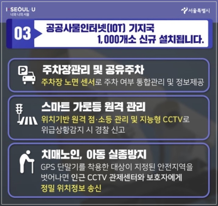 이를테면 공유주차나 스마트 가로등, 노인이나 아이들의 실종방지와 같은 것들입니다.한편, 서울시는 SSID(식별자) 단일화 및 인증과정 간편화 등 공공 와이파이 품질관리 및 운영기준을 마련 중이다. 공공 와이파이의 설치주체(시, 구, 이통사 등)가 다양해 유지관리 체계가 통일돼 있지 않아 전파간섭, 연결 끊김, 복잡한 인증 과정으로 인한 시민들의 불편을 감소시킨다는 계획입니다.