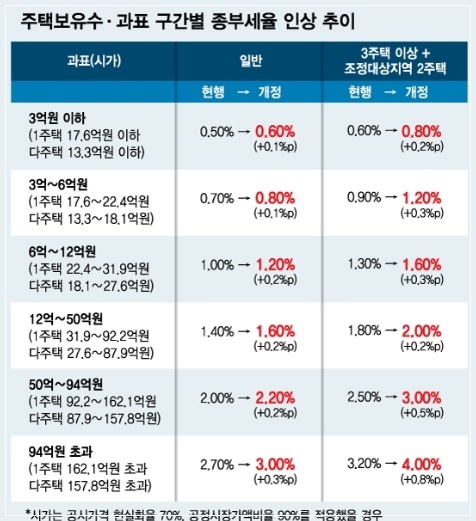 1주택자와 조정대상지역 외 2주택 보유자에 대한 종부세 세율이 기존에 비해 0.1∼0.3% 포인트 인상되고, 3주택 이상 다주택자나 조정대상지역 2주택 보유자에 대한 세율은 0.2∼0.8% 포인트 올라갑니다. 내년도 부동산 공시는 시세가 오른 만큼 전부 공시가격에 반영되고, 특히 고가주택을 중심으로 현실화율이 높아지며, 30억 원 이상은 80% 수준까지 반영됩니다.